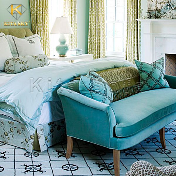 Nhấn nhá sofa màu lam ngọc tại phòng ngủ cùng một vài phụ kiện bé xinh